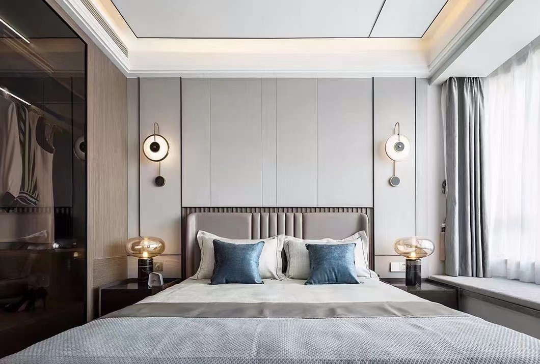 卧室床头简单硬包造型,搭配木色柜子,玻璃柜门,时尚又不失温馨。