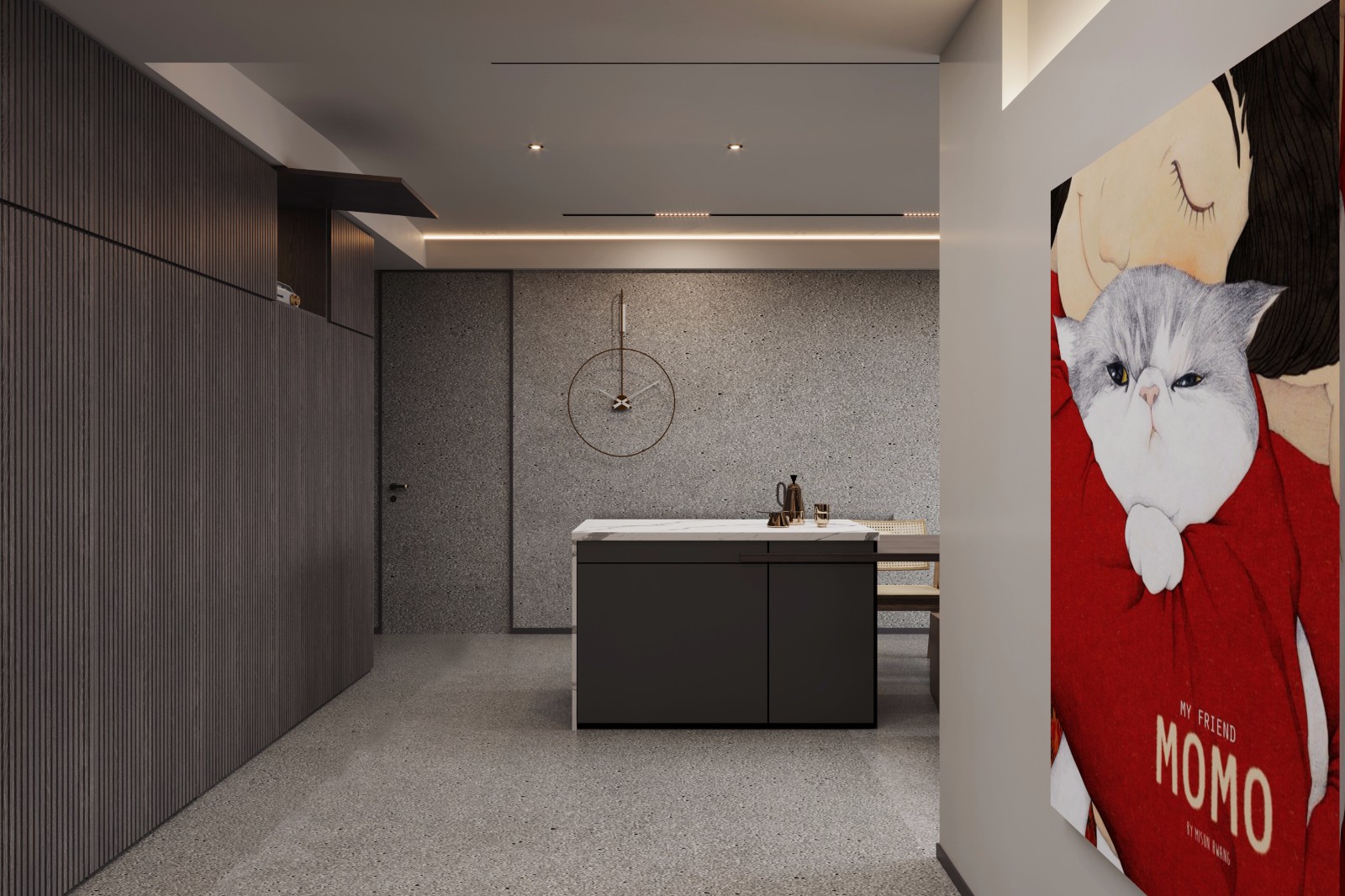 本案业主是一个平面设计师,对设计的要求的简洁、有秩序感、客户在家办公的要求以及对设计的结构要求比较高,不需要太常规的沙发客厅等等,本案厨房做出了回游动线,扩大了餐厅面积以及增加了许多收纳功能,做出了洗衣功能区,材质上大量使用微水泥,线条简洁与柔和的色彩上秉承黑白灰为主调。打造出一个素净、有格调的室内环境。